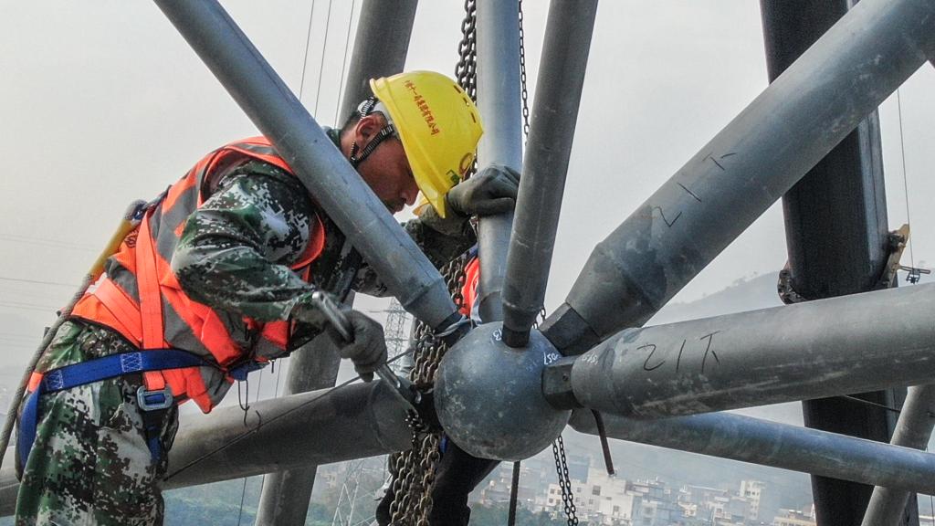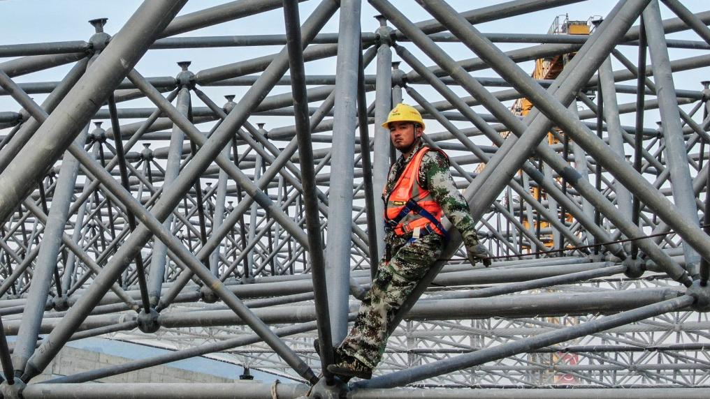 23日、南珠高速鉄道の岑溪東駅建設現場で働く鉄骨組立工。(玉林=新華社記者/張愛林)