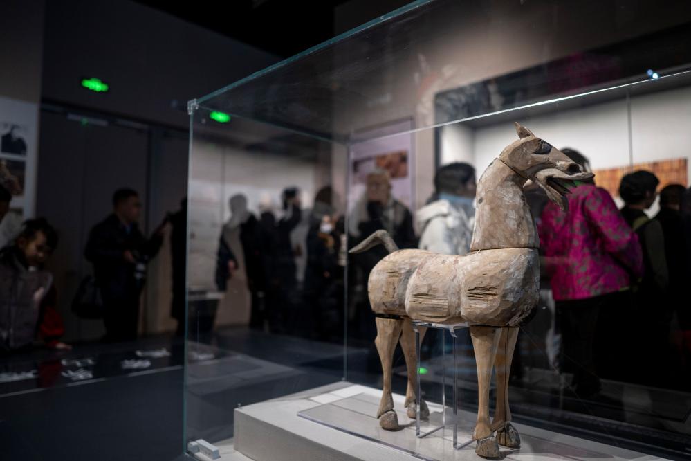 28日、内モンゴル博物院で展示された両漢時代の木馬。(フフホト=新華社記者/連振)