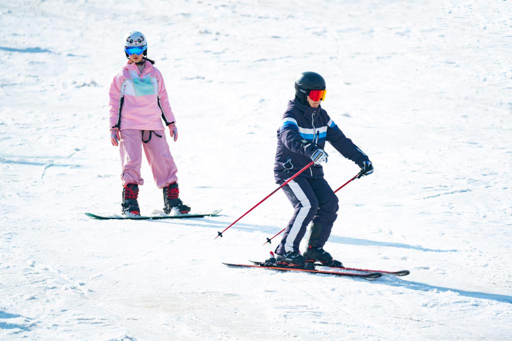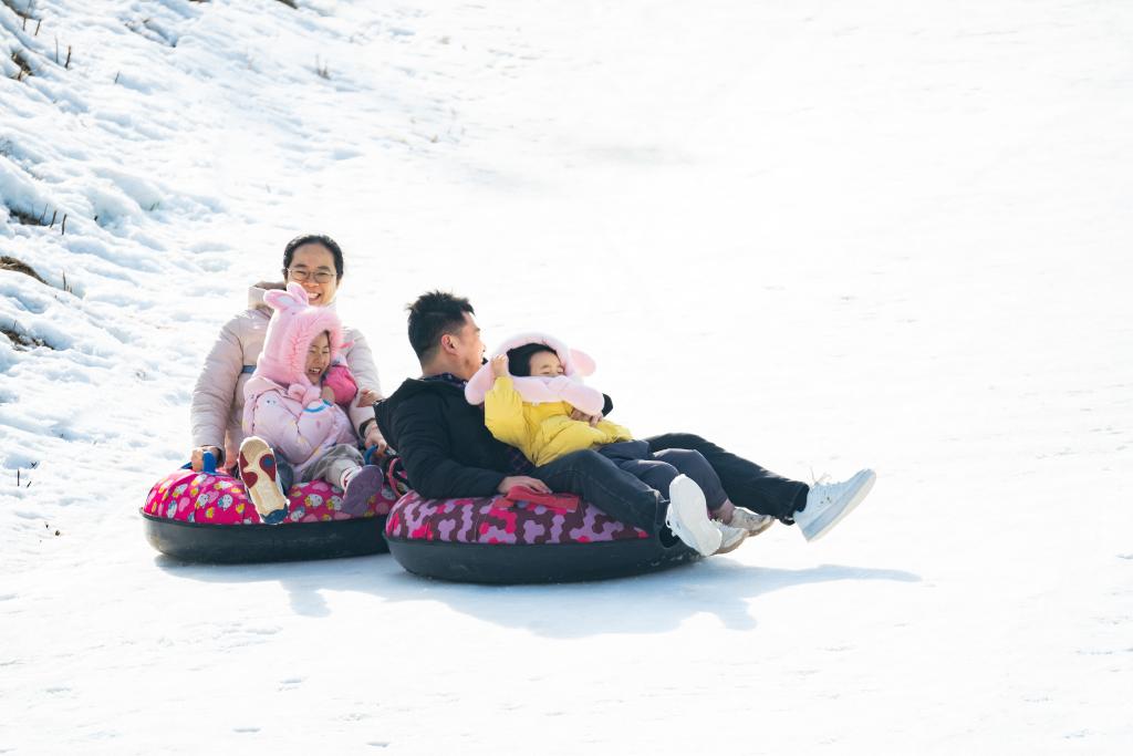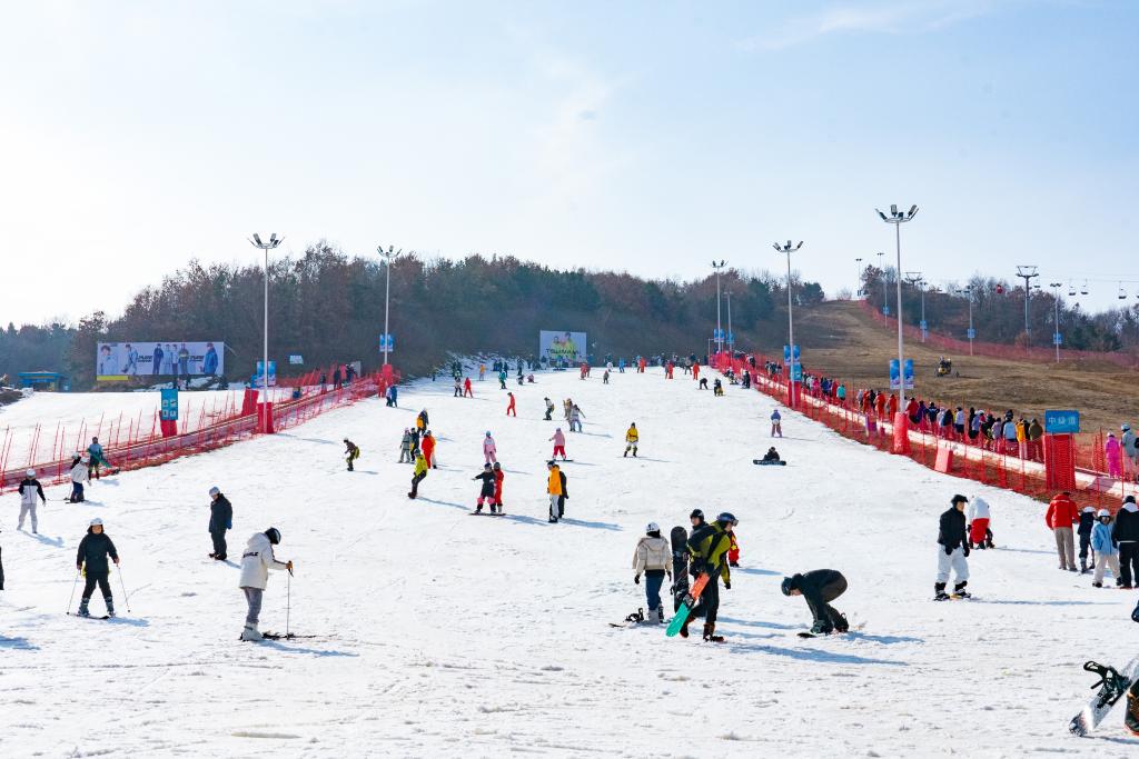3日、青島市西海岸新区にある融創蔵馬山スキー場を訪れた観光客。(青島=新華社配信)