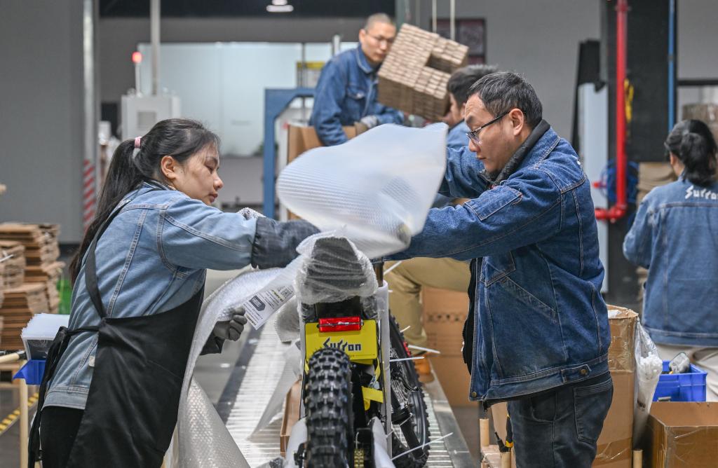 12月24日、虬竜科技の工場で新エネバイクを梱包する従業員。(重慶=新華社記者/陳誠)