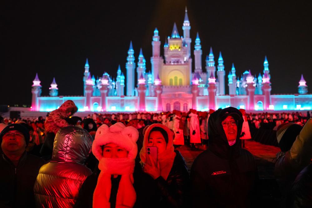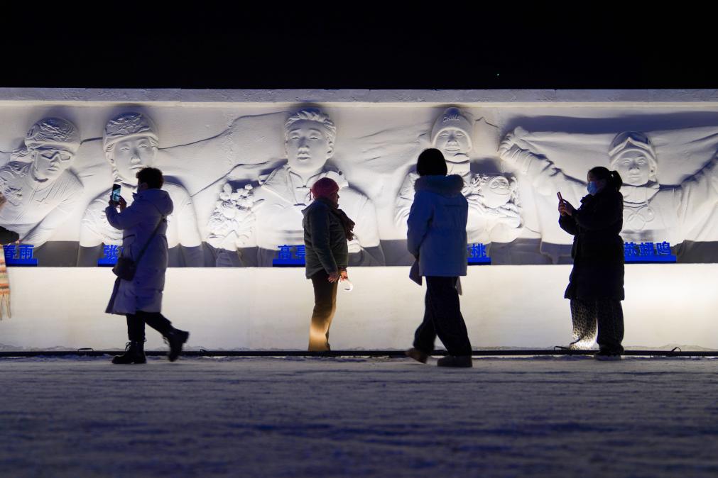 6日、始動式の会場で「氷雪チャンピオン」雪像彫刻ウォールを見る市民。(長春=新華社記者/許暢)