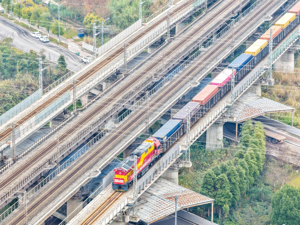7日、重慶市果園港の魚嘴駅を出発する重慶製新エネ車を積載した鉄道・海上複合一貫輸送専用列車。(ドローンから、重慶=新華社記者/唐奕)