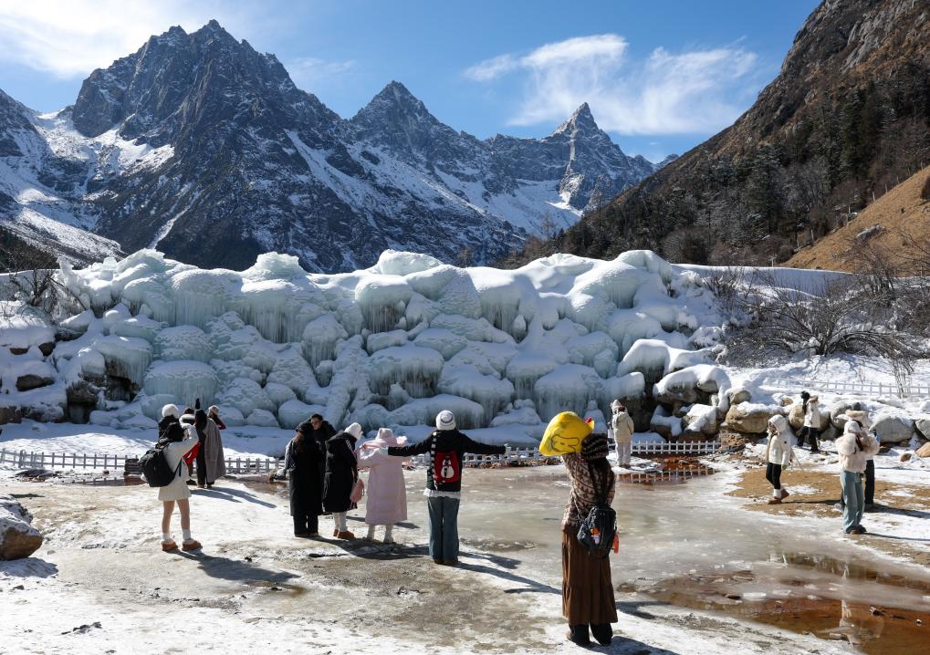 5日、理県畢棚溝スキー場の氷結した滝の前で記念撮影する観光客。(理県=新華社記者/江宏景)