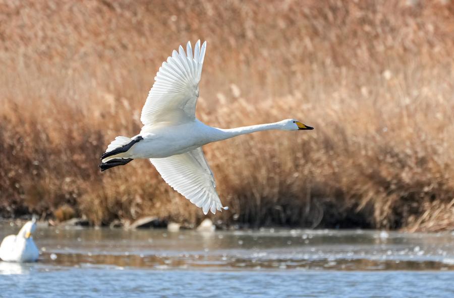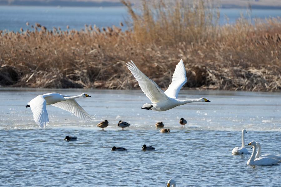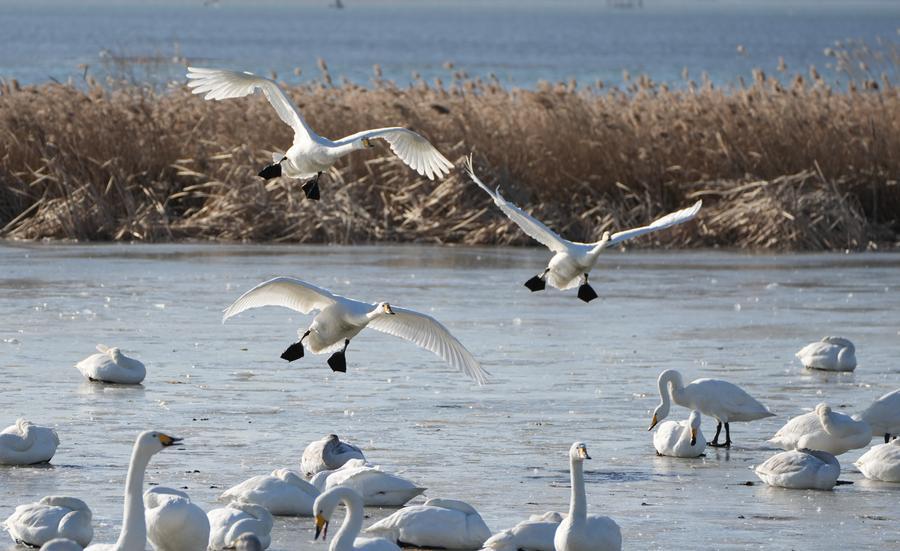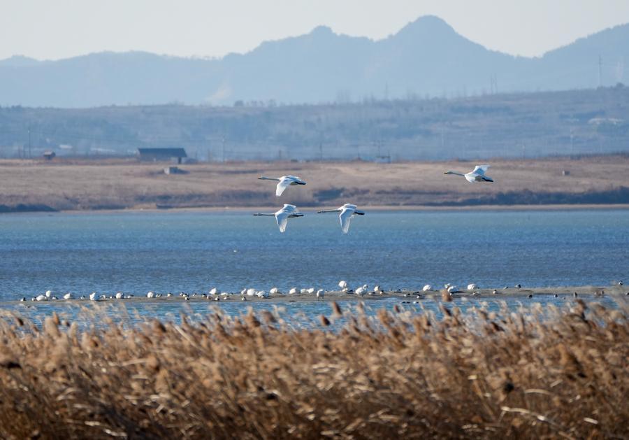5日、栄成市の大天鵝国家級自然保護区を飛ぶオオハクチョウ。(栄成=新華社記者/徐速絵)