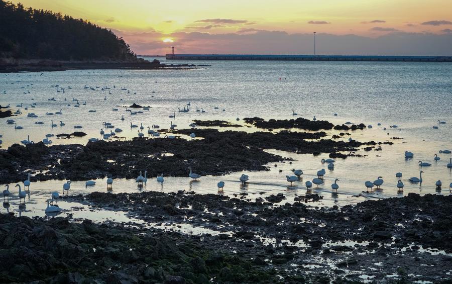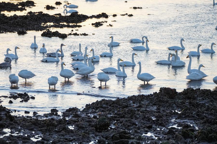 【新華社栄成1月8日】中国山東省栄成市ではオオハクチョウ6千羽以上が越冬のため飛来している。同市は渡り鳥の重要な中継地で、毎年多くのオオハクチョウがシベリアなどから飛来する主要な越冬地の一つでもある。