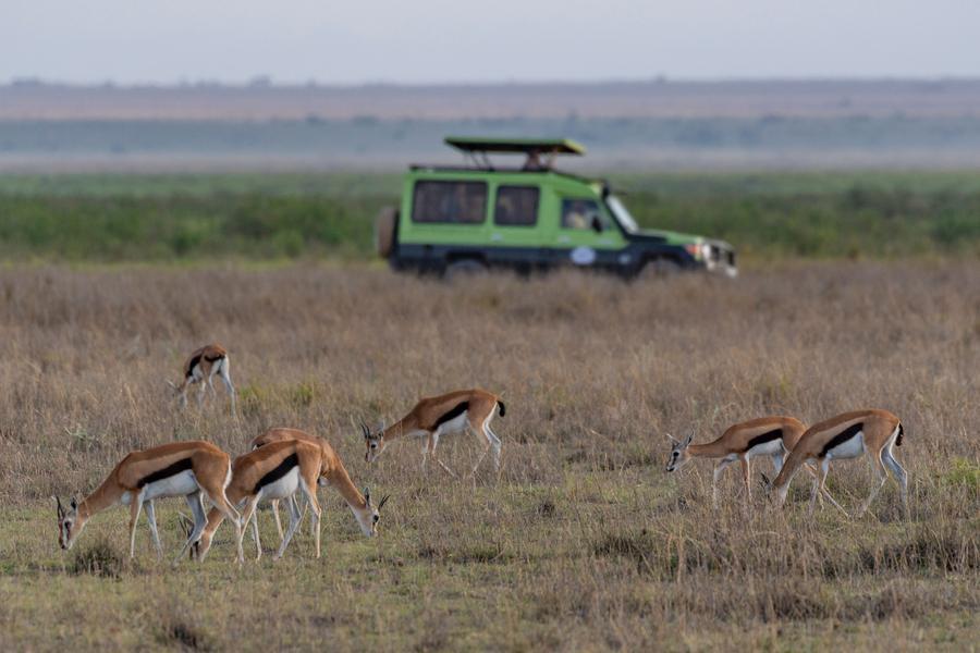 8日、ケニアのアンボセリ国立公園で、車からゾウを観察する観光客。(ナイロビ=新華社記者/謝剣飛)