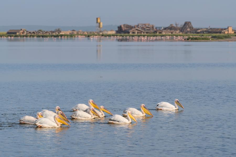 8日、ケニアのアンボセリ国立公園に生息するペリカン。(ナイロビ=新華社記者/謝剣飛)