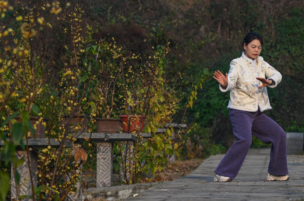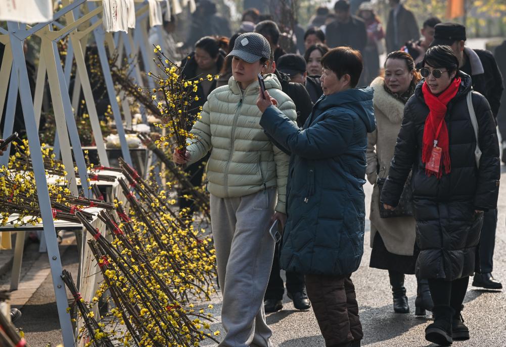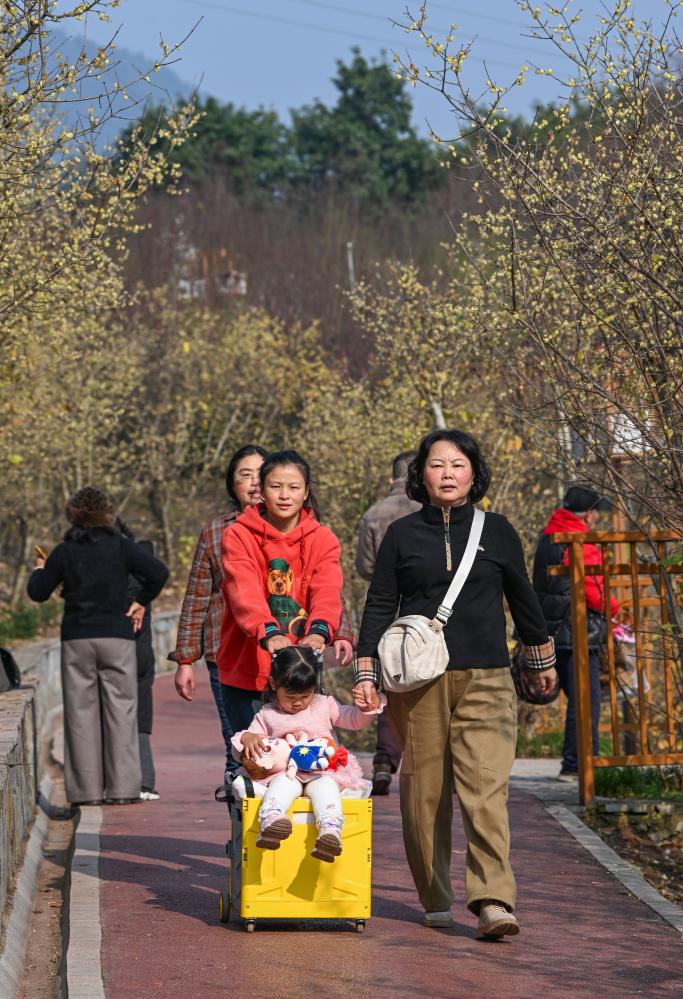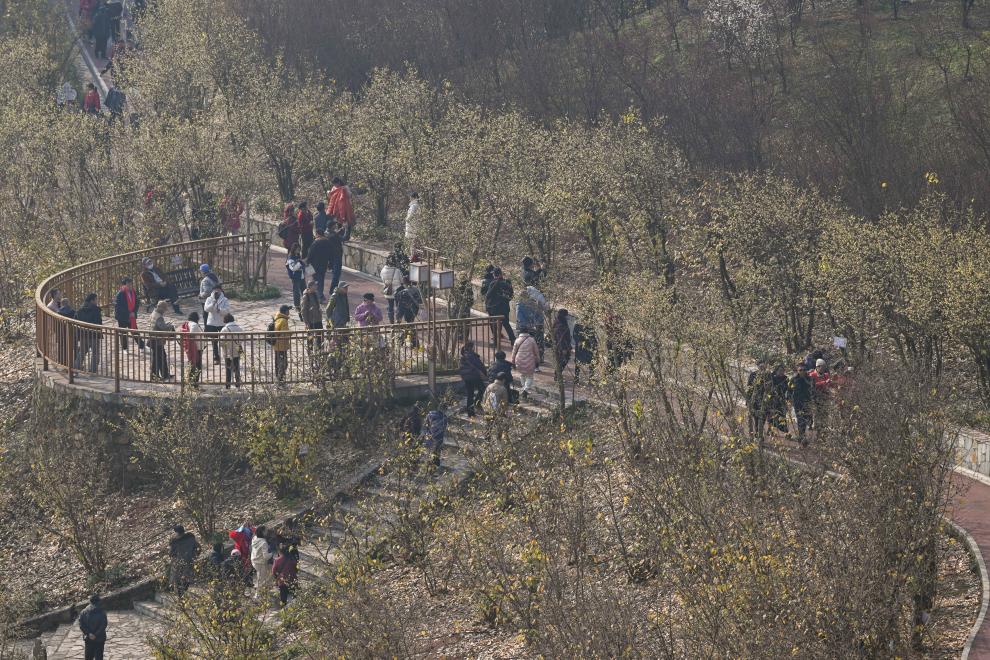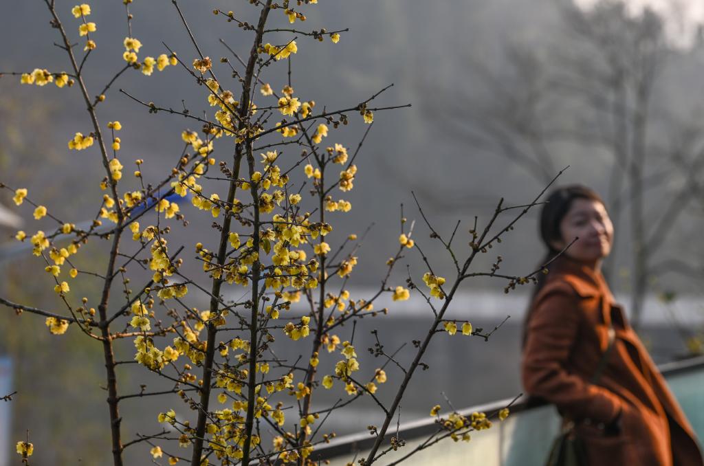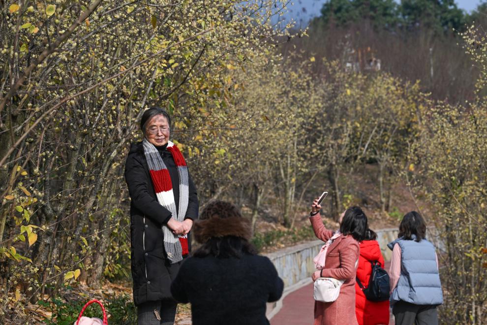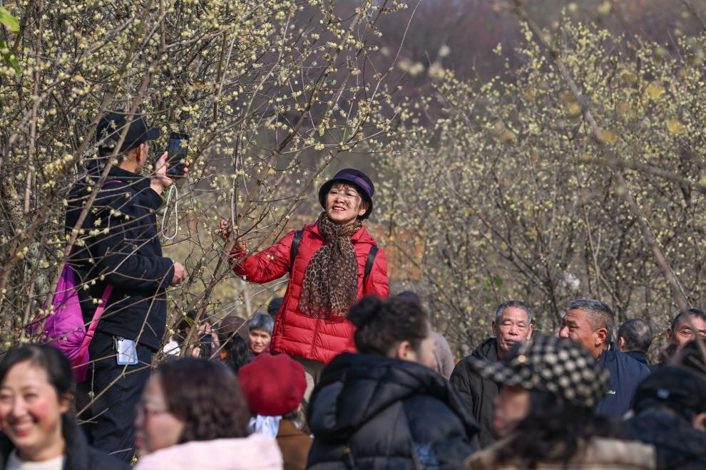 9日、重慶市北碚区静観鎮のロウバイ博覧園で花見を楽しむ観光客。(重慶=新華社記者/陳誠)