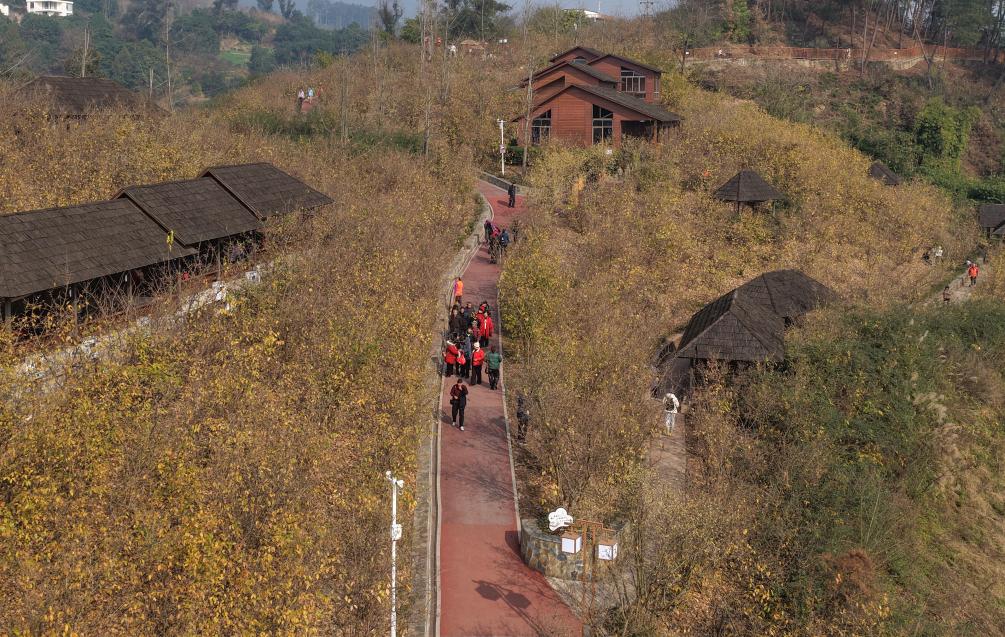 9日、重慶市北碚区静観鎮のロウバイ博覧園で花見を楽しむ観光客。(ドローンから、重慶=新華社記者/陳誠)