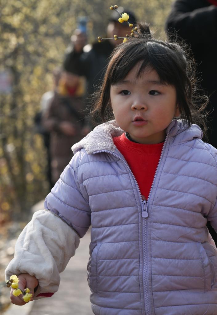 9日、重慶市北碚区静観鎮のロウバイ博覧園で花見を楽しむ子供。(重慶=新華社記者/陳誠)