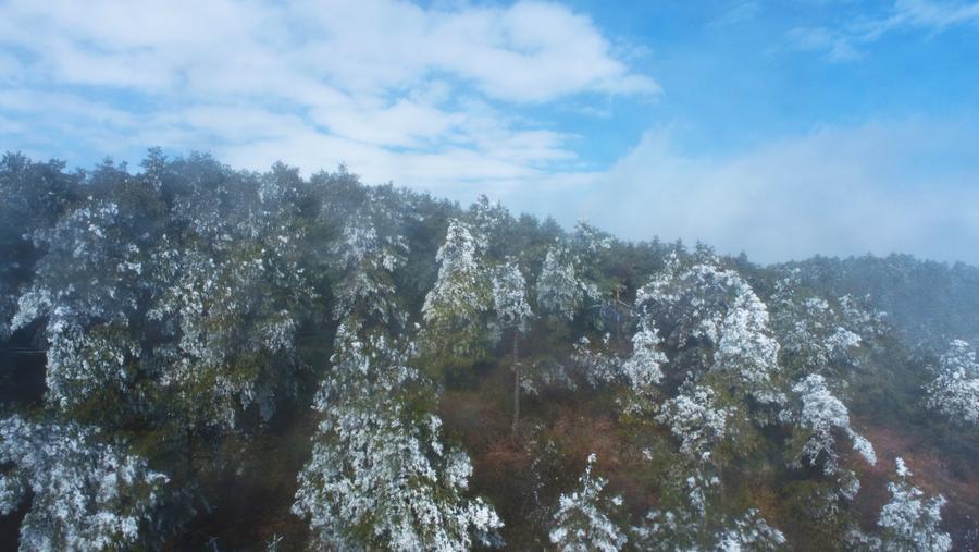 7日、梁王山に出現した霧氷。(ドローンから、澄江=新華社配信/徐万林)