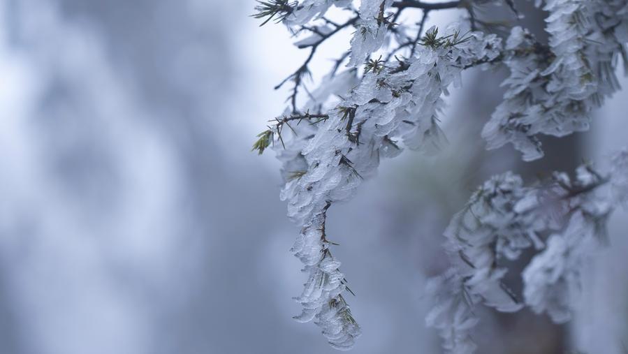 【新華社澄江1月13日】中国雲南省澄江市の北西に位置する梁王山で7日、寒気の影響により霧氷が現れた。冬は標高差と水蒸気の条件がそろい、霧氷が形成されやすい。木々が氷に覆われ、山全体が輝いて見える。