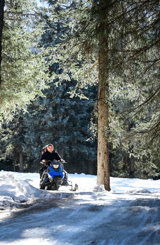 10日、祁連県の阿咪東索林海キャンプ場でスノーモービルに乗る観光客。(祁連=新華社記者/斉芷玥)