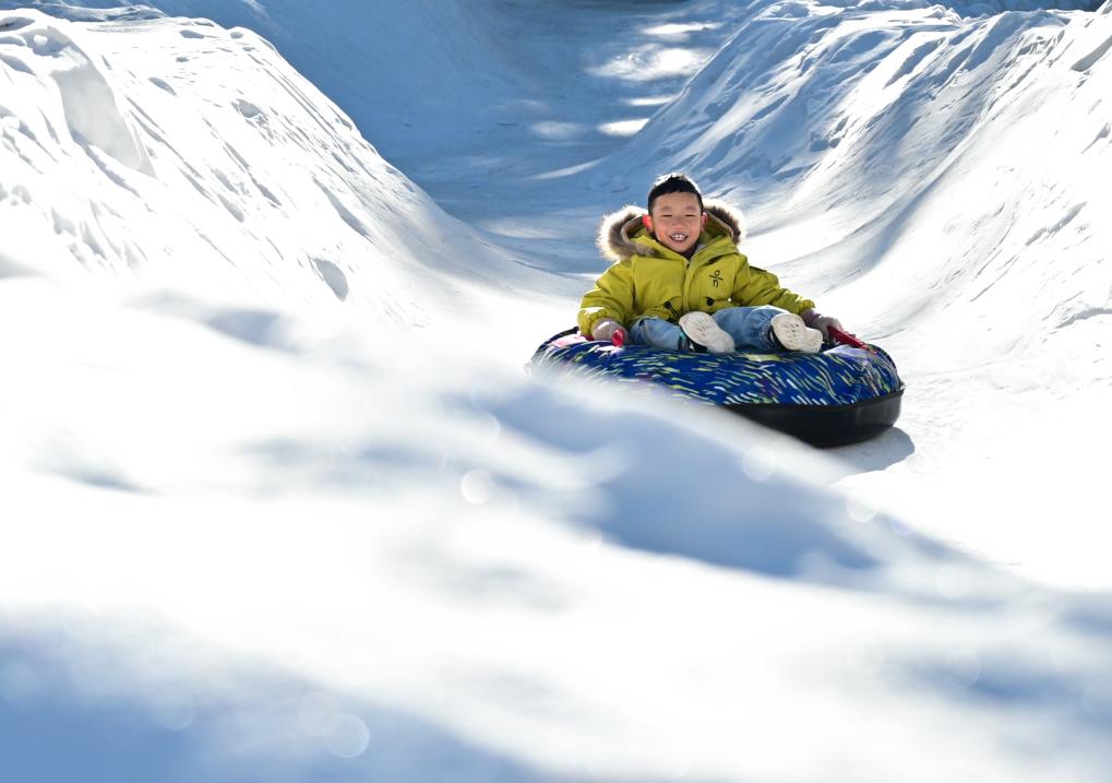 10日、祁連県の阿咪東索林海キャンプ場で氷雪アクティビティーを体験する子ども。(祁連=新華社記者/斉芷玥)