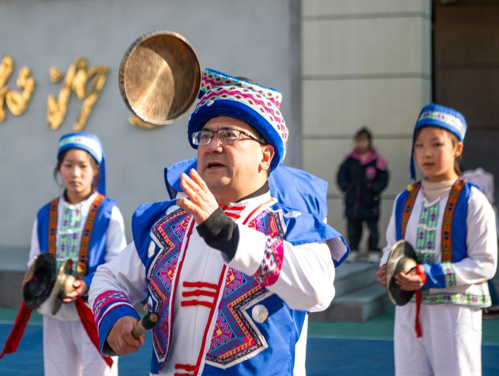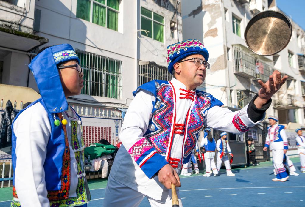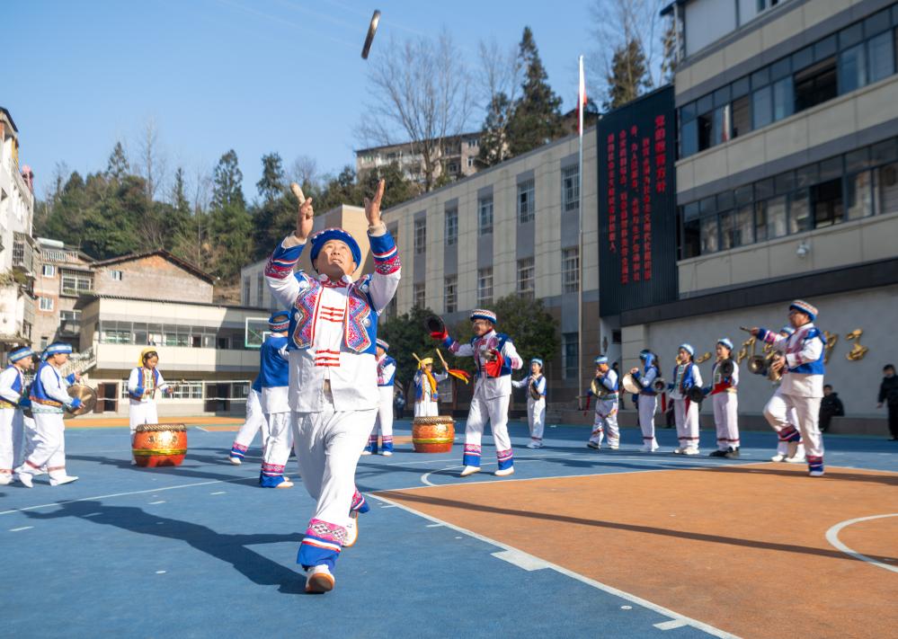 9日、石柱トゥチャ族自治県の小学校で、民間芸能「丟馬鑼(ちゅうばら)」を実演する無形文化遺産継承者。(重慶=新華社記者/唐奕)
