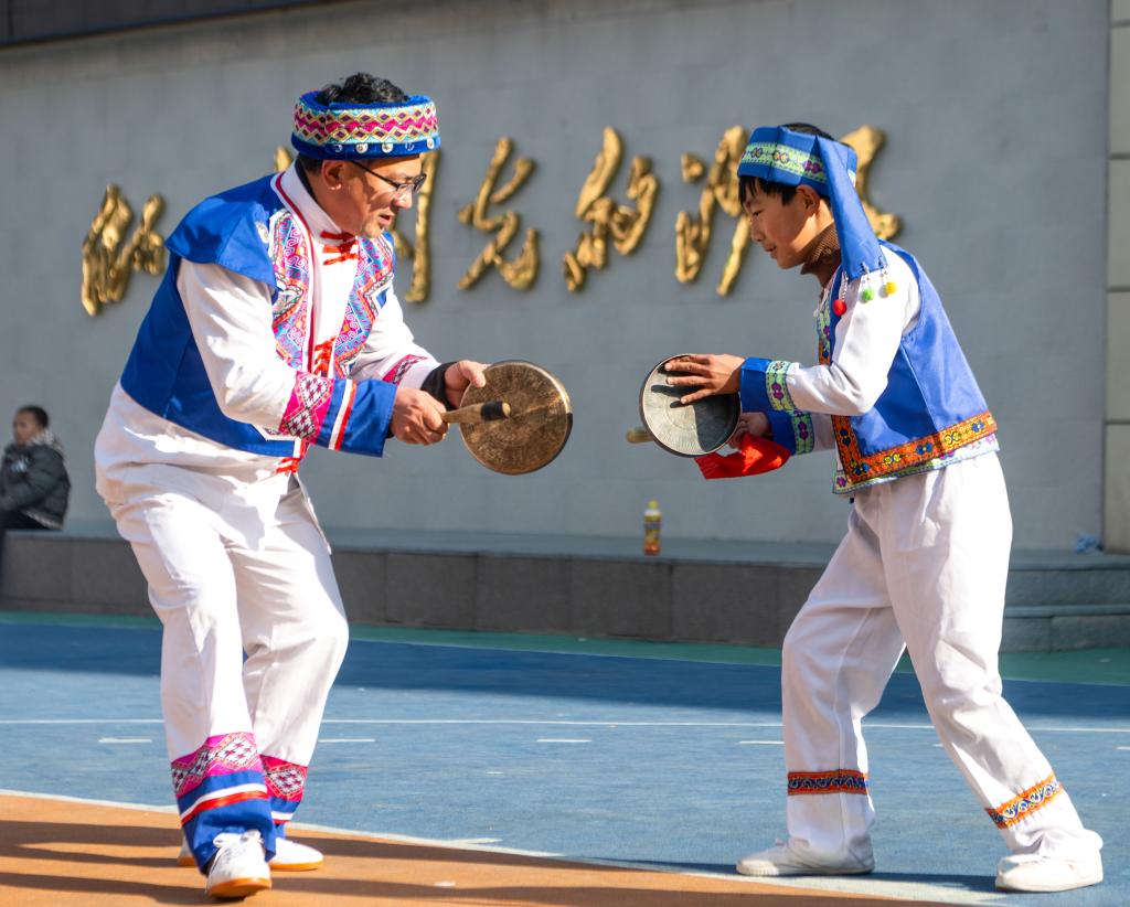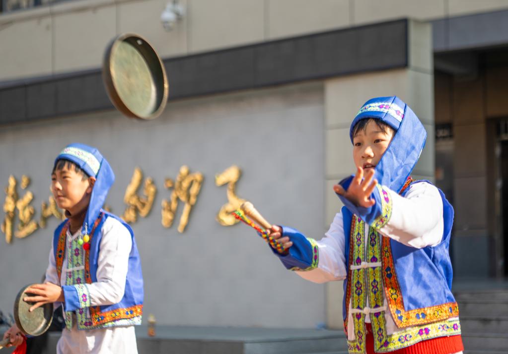 9日、石柱トゥチャ族自治県の小学校で、銅鑼(どら)と太鼓で演奏しながら銅鑼を空中に投げてキャッチする民間芸能「丟馬鑼(ちゅうばら)」を実演する無形文化遺産継承者(右)。(重慶=新華社記者/唐奕)