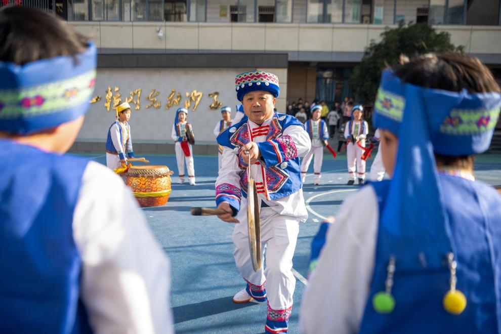 9日、石柱トゥチャ族自治県の小学校で、民間芸能「丟馬鑼(ちゅうばら)」を実演する無形文化遺産継承者(中央)。(重慶=新華社記者/唐奕)