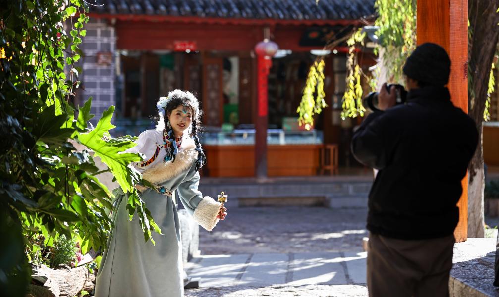 13日、麗江古城で少数民族の衣装を着て写真を撮る観光客。(麗江=新華社記者/江文耀)
