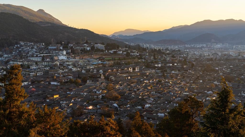 14日、麗江古城の日の出。(麗江=新華社記者/高咏薇)