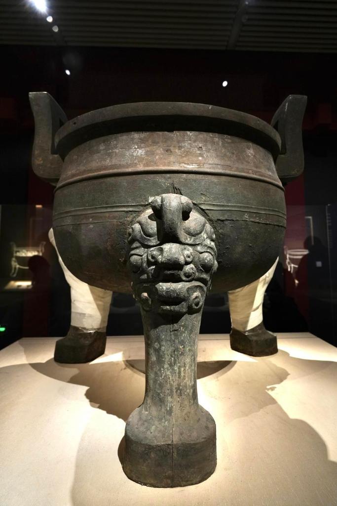 14日、「安徽淮南武王墩1号墓考古成果展」で展示された青銅鑊鼎(かくてい)。(北京=新華社記者/許芸潁)