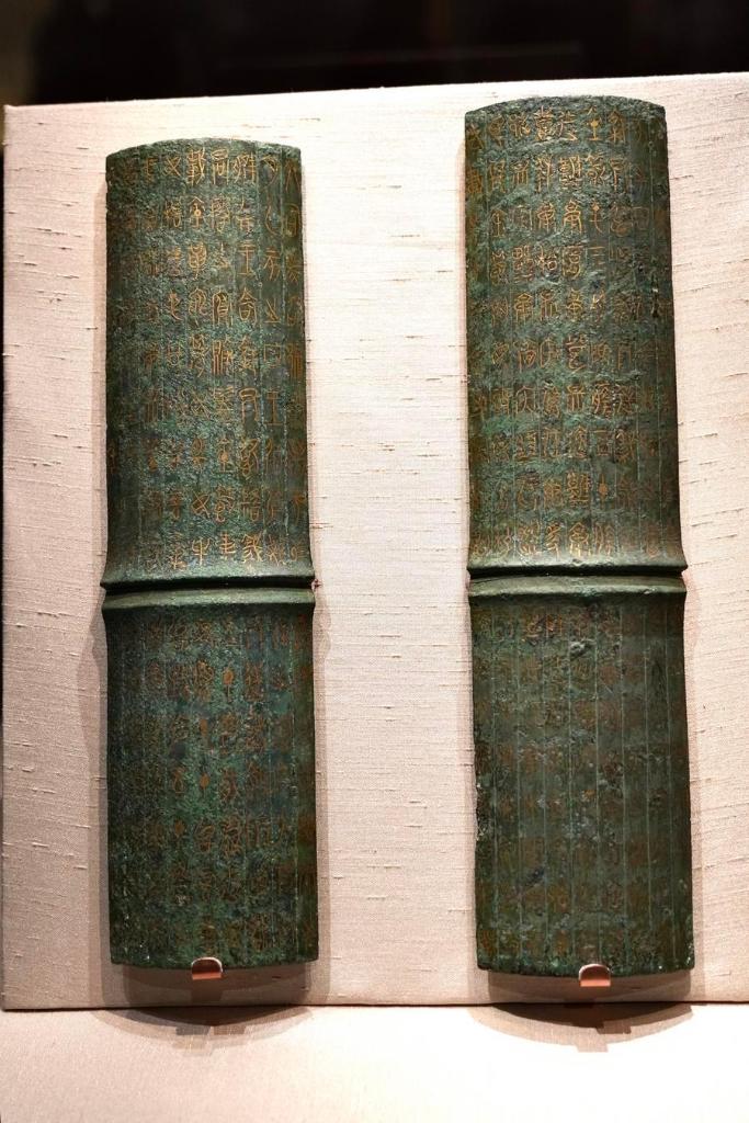 14日、「安徽淮南武王墩1号墓考古成果展」で展示された「鄂君啓」錯金青銅節。(北京=新華社記者/許芸潁)
