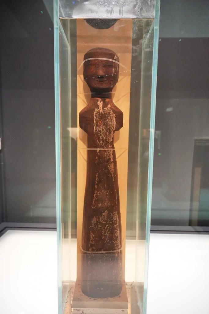 14日、「安徽淮南武王墩1号墓考古成果展」で展示された木俑。(北京=新華社記者/許芸潁)