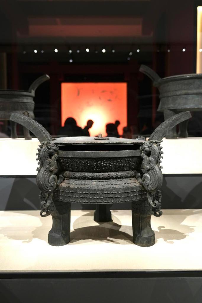 14日、「安徽淮南武王墩1号墓考古成果展」で展示された青銅昇鼎(しょうてい)。(北京=新華社記者/許芸潁)