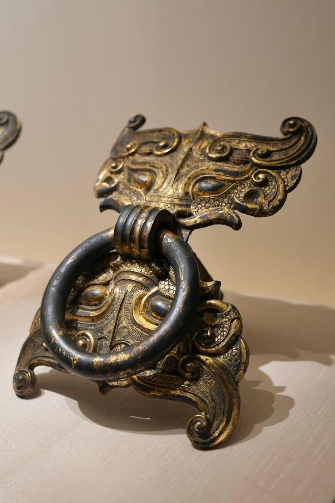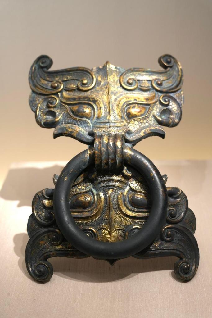 14日、「安徽淮南武王墩1号墓考古成果展」で展示された青銅鼓環。(北京=新華社記者/許芸潁)