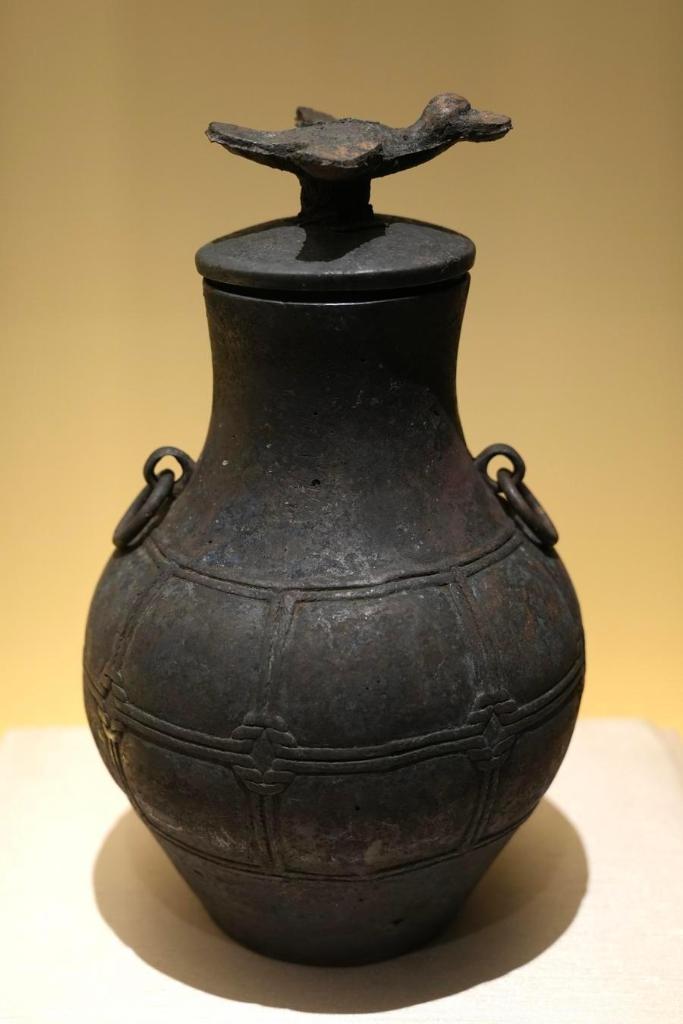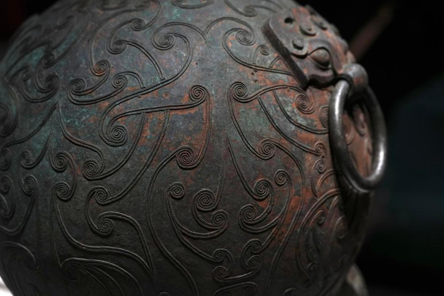 14日、「安徽淮南武王墩1号墓考古成果展」で展示された青銅円壺。(北京=新華社記者/許芸潁)