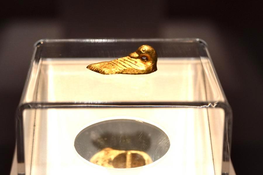 14日、「安徽淮南武王墩1号墓考古成果展」で展示された鴨型金飾。(北京=新華社記者/許芸潁)