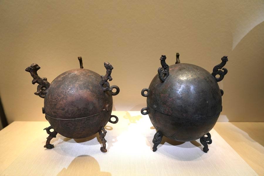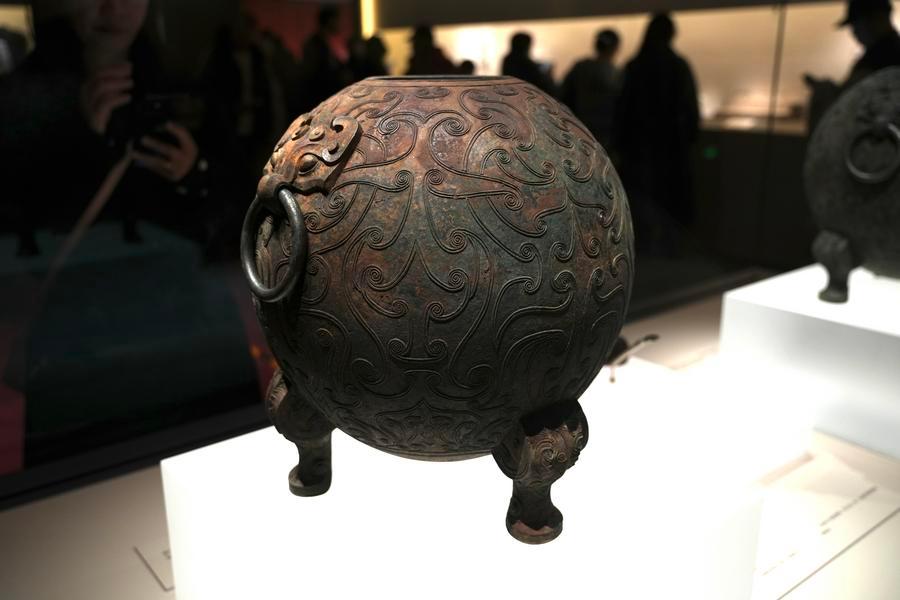 14日、「安徽淮南武王墩1号墓考古成果展」で展示された球形青銅甕(おう)。(北京=新華社記者/許芸潁)