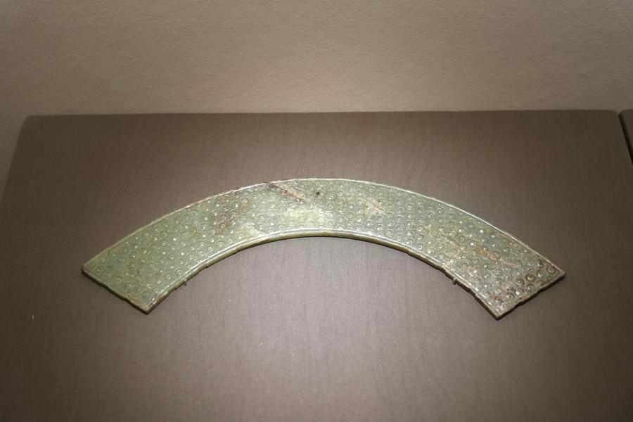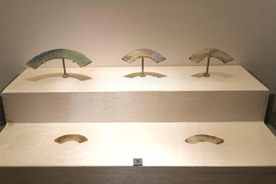 14日、「安徽淮南武王墩1号墓考古成果展」で展示された玉珩(ぎょくこう)。(北京=新華社記者/許芸潁)