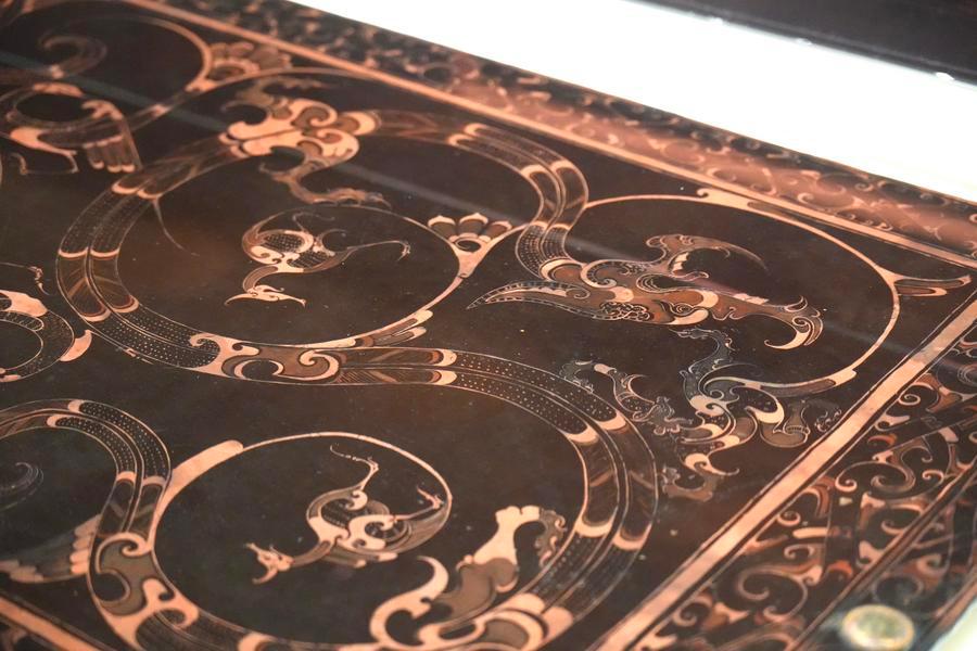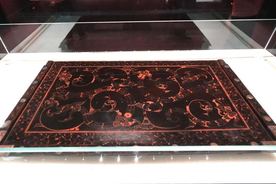 14日、「安徽淮南武王墩1号墓考古成果展」で展示された彩絵竜鳳文漆木案。(北京=新華社記者/許芸潁)