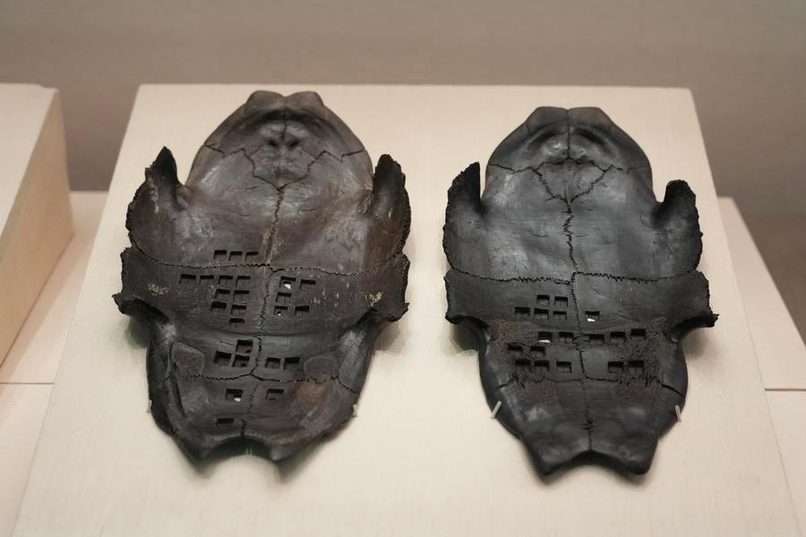 14日、「安徽淮南武王墩1号墓考古成果展」で展示された亀甲。(北京=新華社記者/許芸潁)