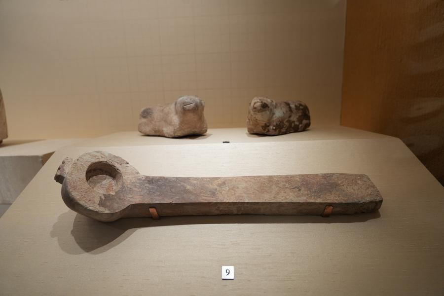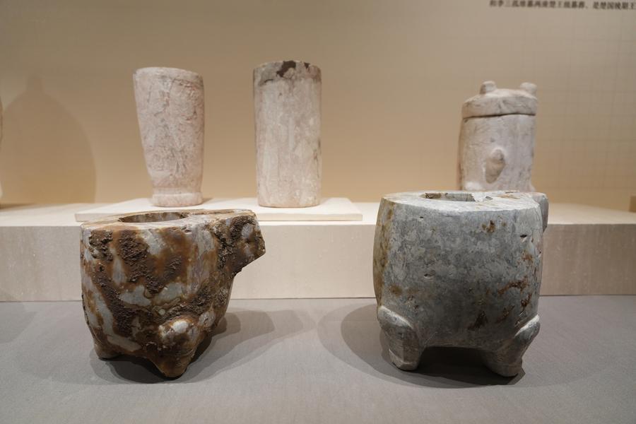 14日、「安徽淮南武王墩1号墓考古成果展」で展示された石器。(北京=新華社記者/許芸潁)