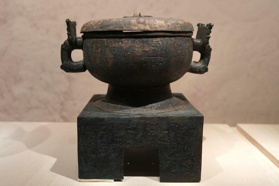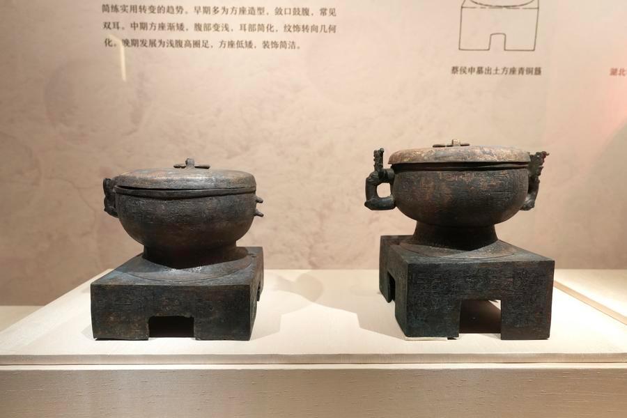 14日、「安徽淮南武王墩1号墓考古成果展」で展示された方底青銅簋(き)。(北京=新華社記者/許芸潁)