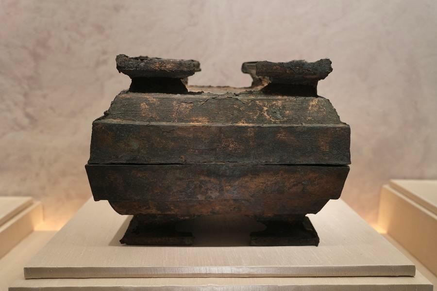 14日、「安徽淮南武王墩1号墓考古成果展」で展示された青銅簠(ほ)。(北京=新華社記者/許芸潁)
