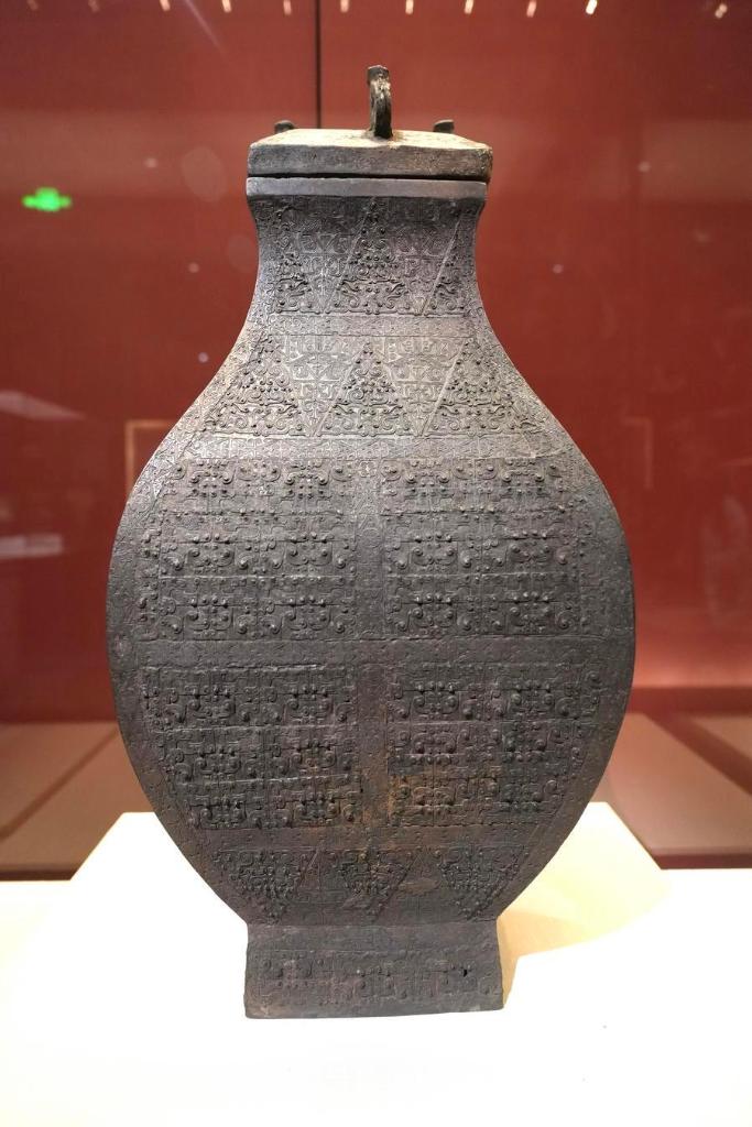 14日、「安徽淮南武王墩1号墓考古成果展」で展示された青銅方壺。(北京=新華社記者/許芸潁)
