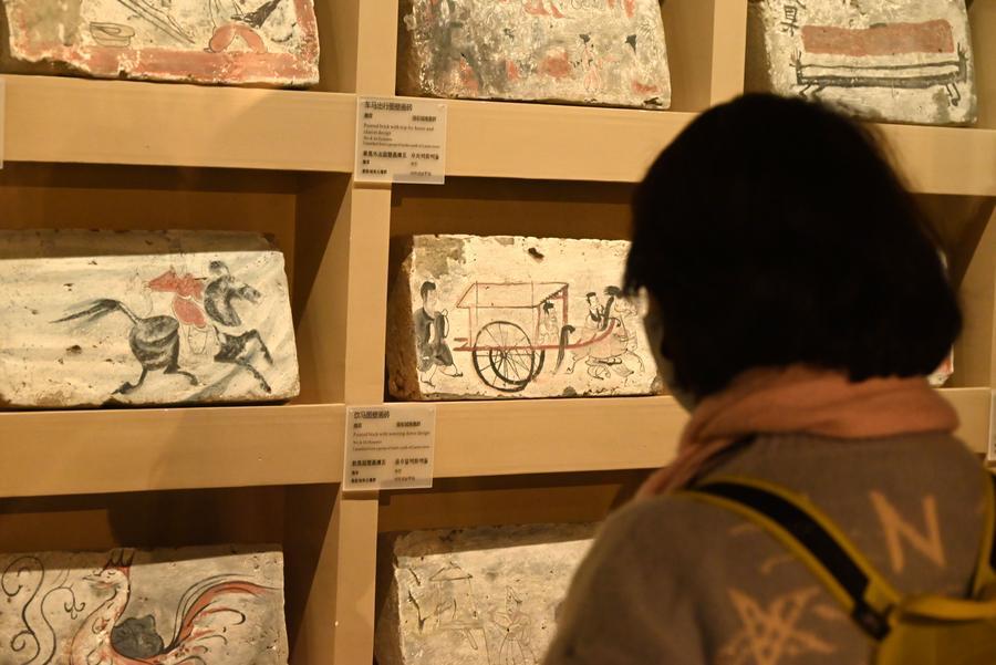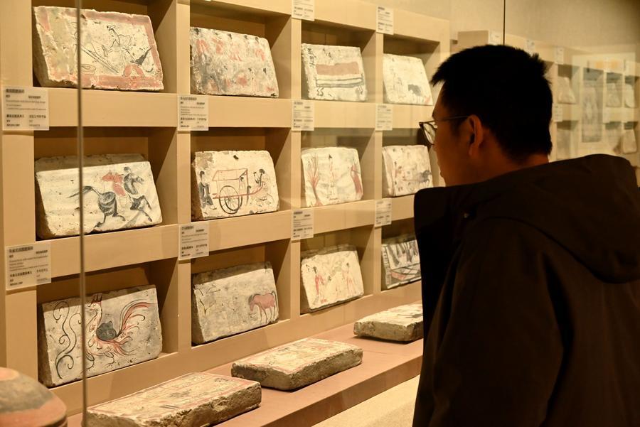 15日、敦煌市博物館に展示された「車馬出行図画像磚」。(敦煌=新華社配信/張暁亮)
