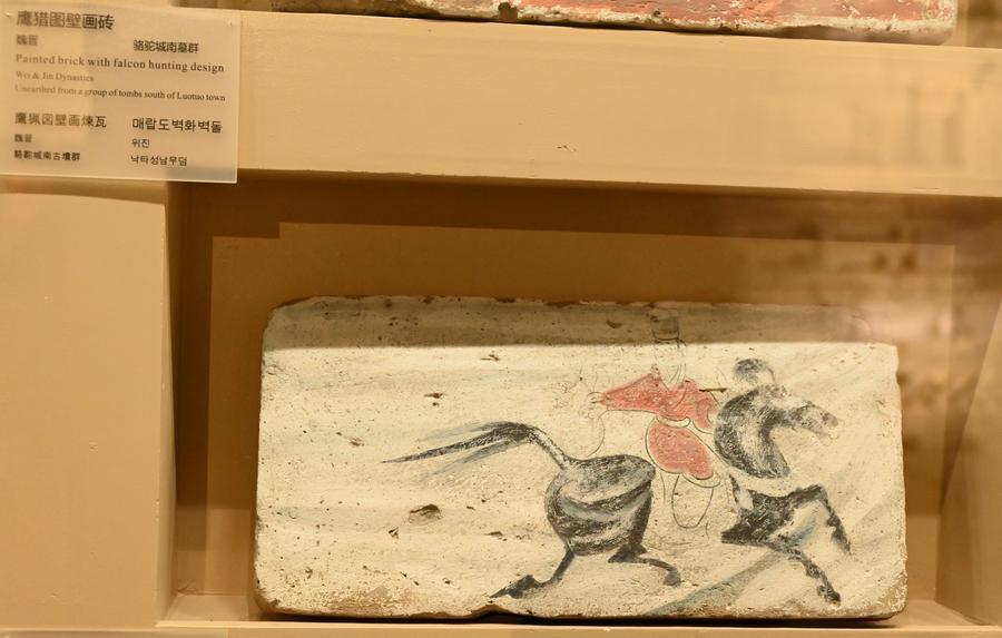 15日、敦煌市博物館に展示された「鷹猟図画像磚」。(敦煌=新華社配信/張暁亮)