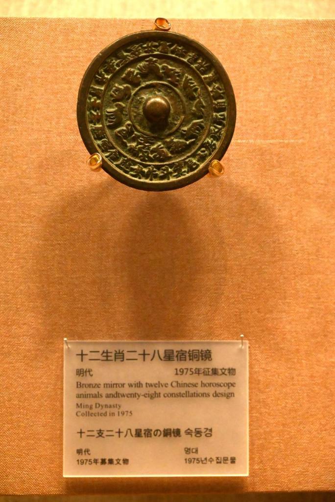 15日、敦煌市博物館に展示された「十二生肖二十八星宿銅鏡」。(敦煌=新華社配信/張暁亮)