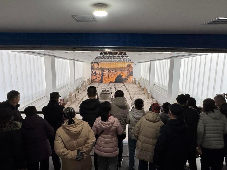 16日、鎮遠橋遺跡館で展示パネルを見る人たち。(太原=新華社記者/王学濤)