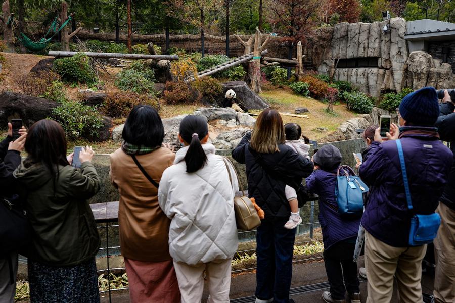 上野動物園でジャイアントパンダのシャオシャオを撮影する人たち。(2025年12月25日撮影、東京=新華社記者/賈浩成)