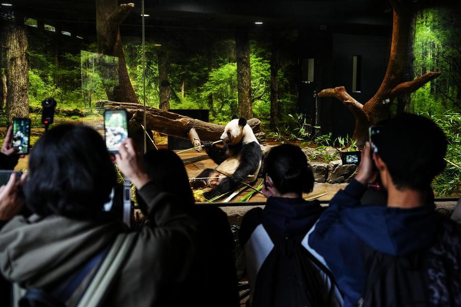 上野動物園で竹を食べるジャイアントパンダのレイレイ。(2025年12月25日撮影、東京=新華社記者/賈浩成)