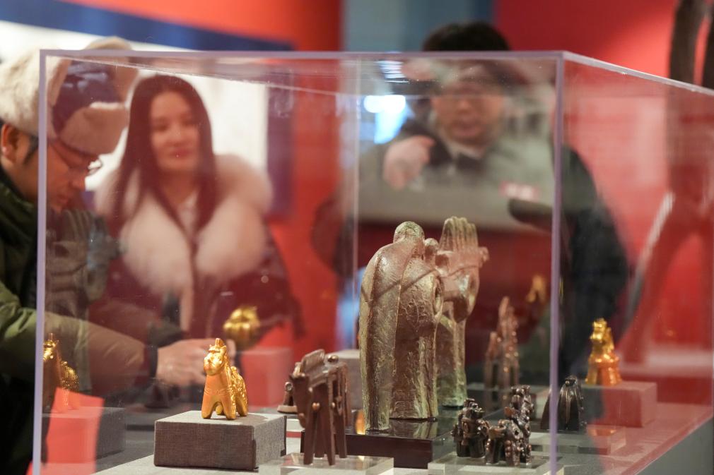 22日、ハルビン市博物館で韓美林馬年芸術展を見学する来館者。(ハルビン=新華社記者/王松)