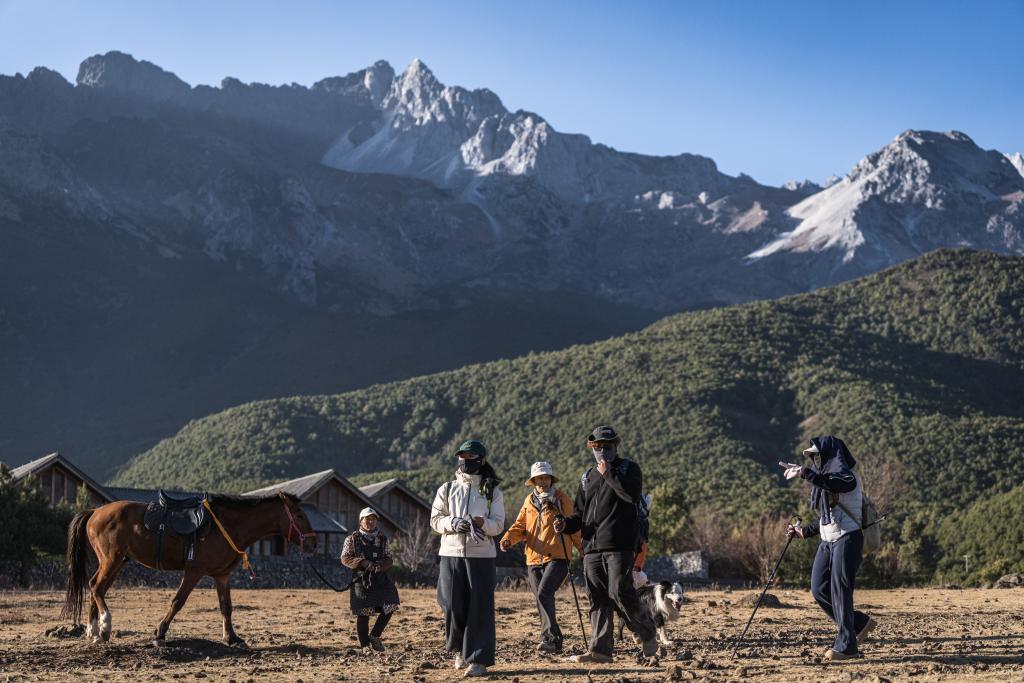 17日、玉湖村でハイキングを楽しむ観光客。(麗江=新華社記者/王冠森)