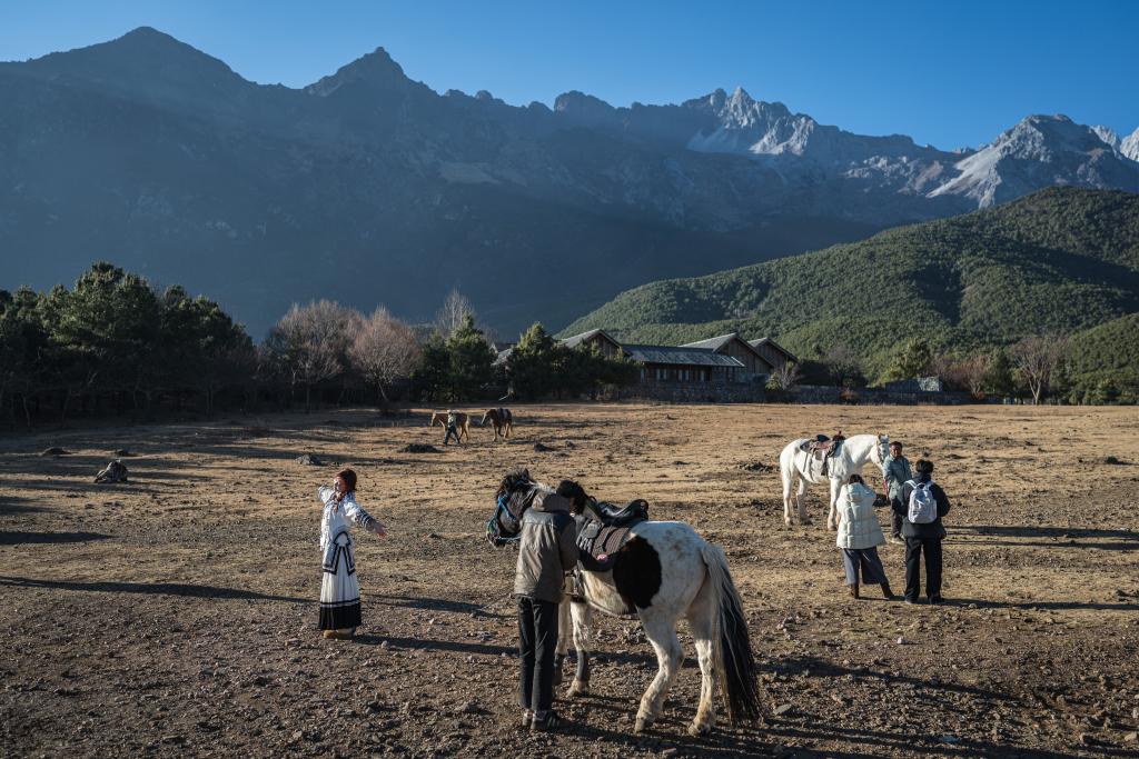 17日、玉湖村の馬場を訪れた観光客。(麗江=新華社記者/王冠森)