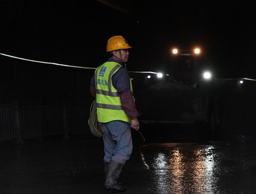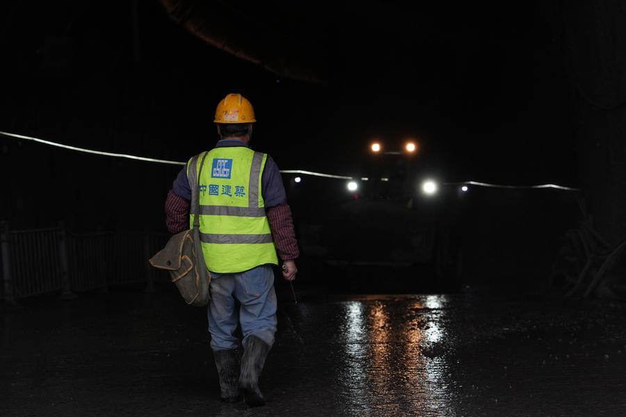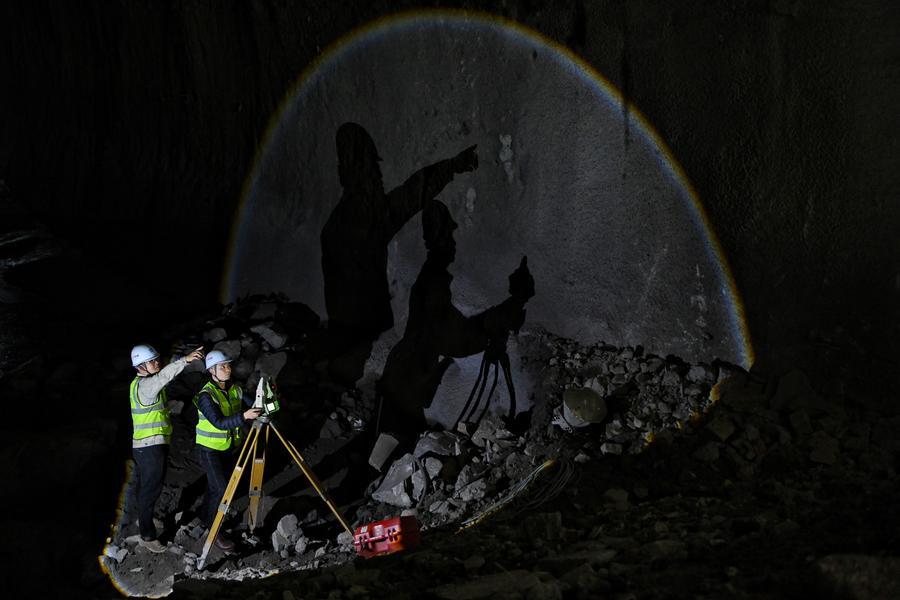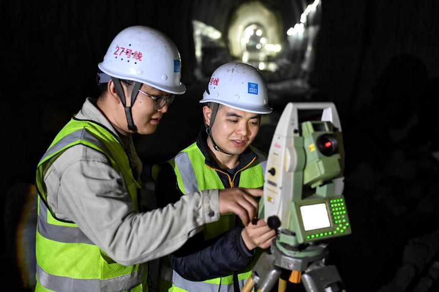 28日、重慶軌道交通の銅鑼山トンネルで貫通前の最終点検に当たる作業員。(重慶=新華社配信)