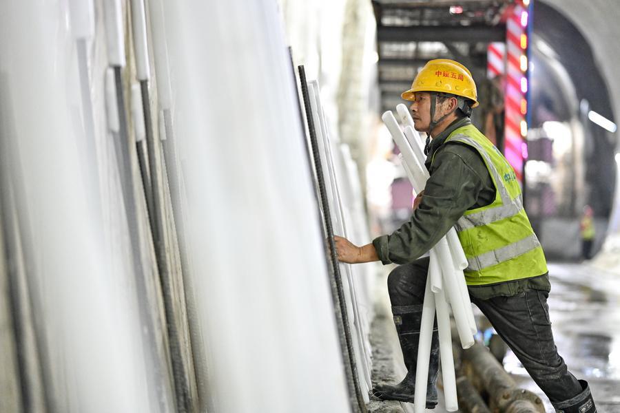 28日、重慶軌道交通の銅鑼山トンネルで工事に当たる作業員。(重慶=新華社配信)