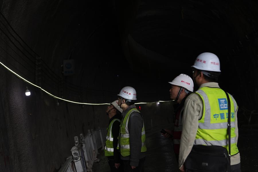 28日、銅鑼山トンネルで検査に当たる重慶軌道交通の工事関係者。(重慶=新華社配信)